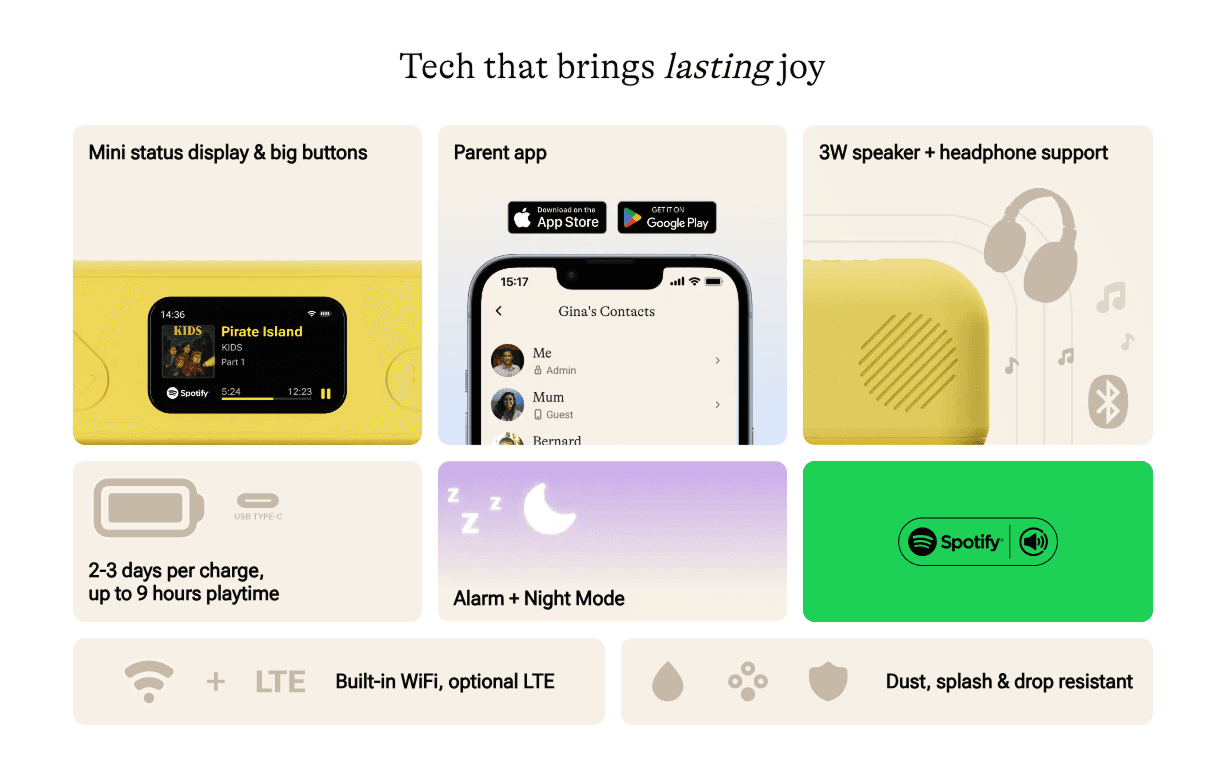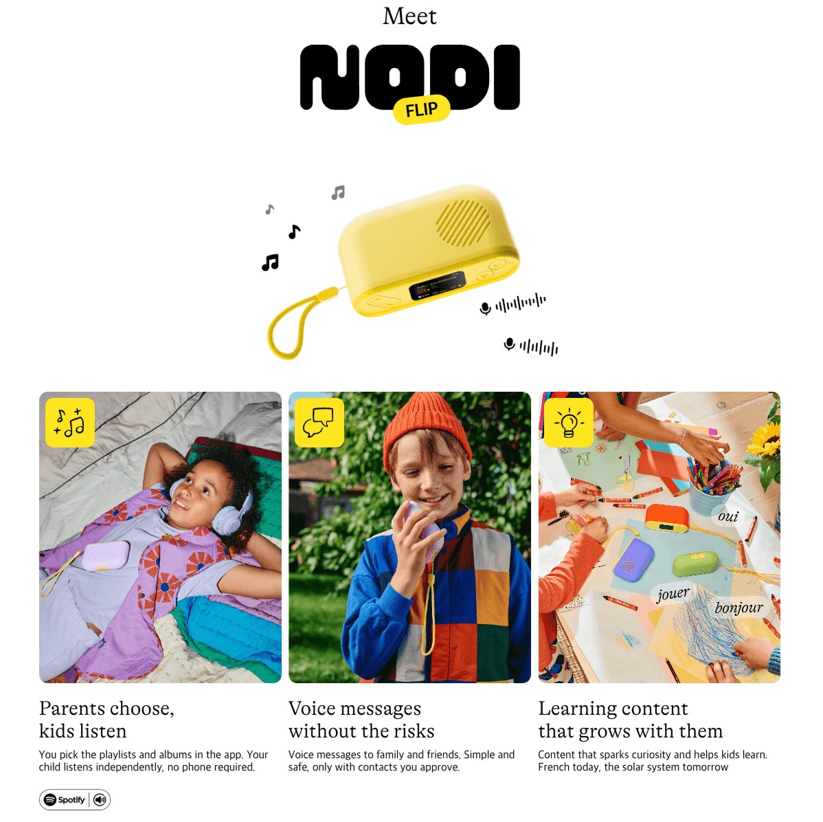 아이들은 NODI Flip의 큰 물리적 버튼으로 기기를 조작합니다. 복잡한 UI는 없고, 작은 화면은 단지 메뉴와 재생 정보를 보여주는 역할만 합니다. 콘텐츠는 Spotify 오디오 라이브러리와 NODI가 큐레이션한 자체 동화 콘텐츠를 중심으로 구성되며, 부모는 연동된 스마트폰 앱을 통해 무엇을 들을지, 누구와 소통할지를 직접 관리합니다.