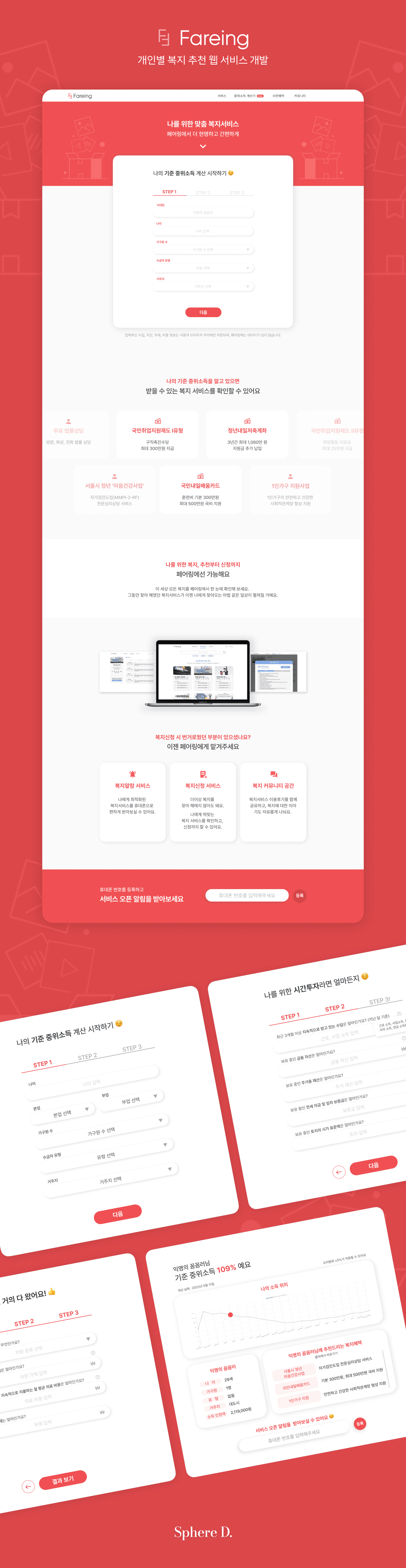 매년 쏟아지는 정부 지원금과 복지 제도. 내가 받을 수 있는 혜택이 뭔지 찾는 것만으로도 하루가 갑니다. Fareing은 이 과정을 단순하게 만듭니다. 복잡한 서류도, 어려운 자격 요건도 고민할 필요 없습니다. 간단한 정보 입력만으로 내가 받을 수 있는 모든 복지 혜택을 한눈에 확인할 수 있습니다.