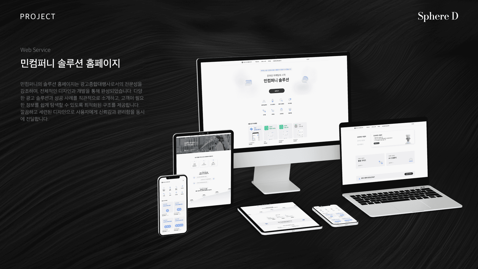 민컴퍼니인터내셔널의 솔루션 홈페이지는 광고 종합 대행사로서의 전문성과 고객 신뢰를 기반으로 설계되었습니다. 깔끔하면서도 세련된 디자인은 민컴퍼니만의 브랜드 가치를 직관적으로 드러내며, 고객이 필요한 정보를 빠르고 쉽게 찾을 수 있도록 최적화되었습니다.