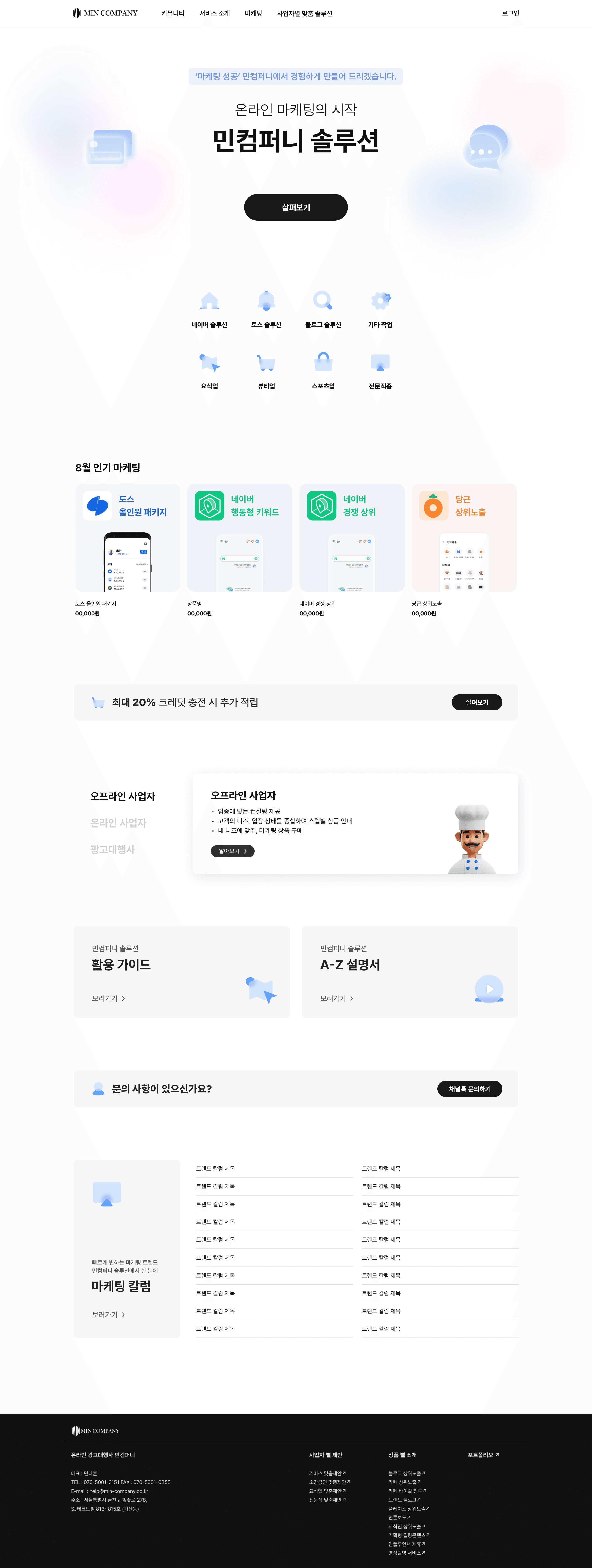 이 홈페이지는 단순히 서비스를 나열하는 공간이 아닙니다. 광고의 시작부터 성공적인 결과에 이르기까지, 민컴퍼니가 고객과 함께한다는 진심을 담았습니다. 고객이 편안함과 신뢰를 느낄 수 있도록, 민컴퍼니는 든든한 파트너로서의 역할을 다하고자 합니다. 이는 단순한 플랫폼이 아닌, 고객과 민컴퍼니를 연결하는 중요한 접점으로 설계되었습니다.